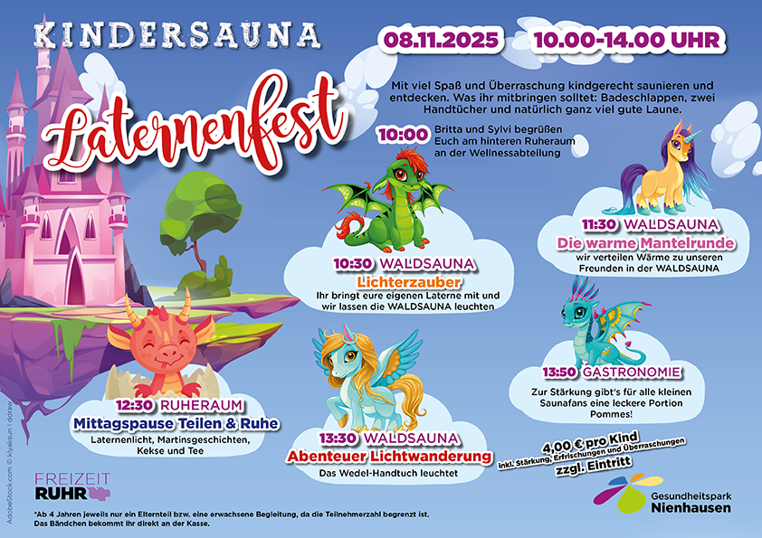 Ab 4 Jahren – mit nur je einem Elternteil /erwachsene Begleitung, da die Teilnehmerzahl begrenzt ist.