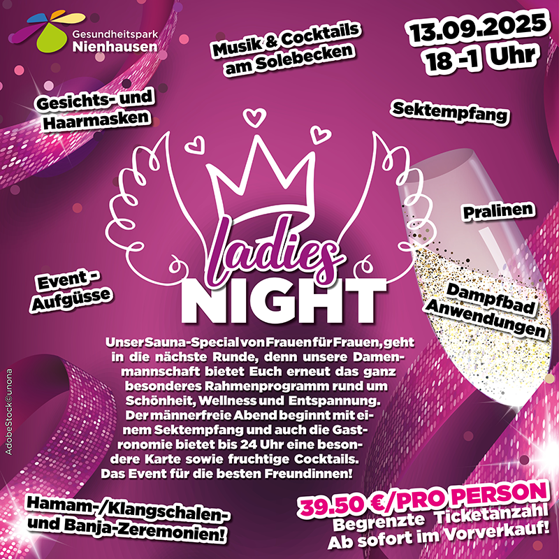 Freut euch auf unser Sauna-Special von Frauen für Frauen, denn unsere Damenmannschaft bietet Euch ein ganz besonderes Rahmenprogramm rund um Schönheit, Wellness und Entspannung. Der männerfreie Abend beginnt mit einem Sektempfang und auch die Gastronomie bietet bis 24 Uhr eine besondere Karte sowie fruchtige Cocktails. Das Event für die besten Freundinnen!