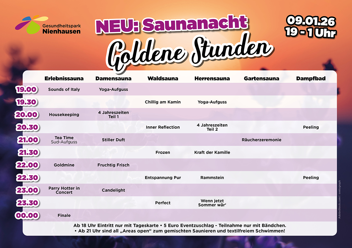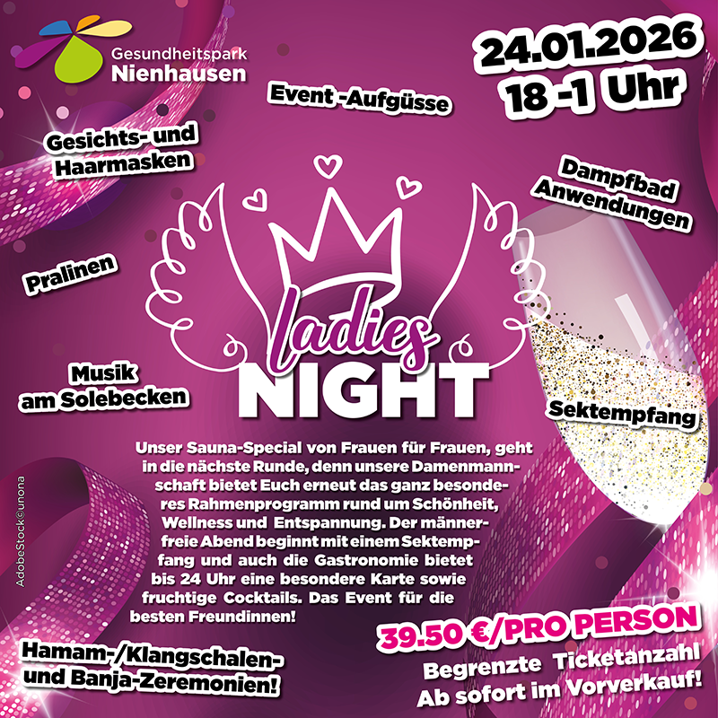 Freut euch auf unser Sauna-Special von Frauen für Frauen, denn unsere Damenmannschaft bietet Euch ein ganz besonderes Rahmenprogramm rund um Schönheit, Wellness und Entspannung. Der männerfreie Abend beginnt mit einem Sektempfang und auch die Gastronomie bietet bis 24 Uhr eine besondere Karte sowie fruchtige Cocktails. Das Event für die besten Freundinnen!