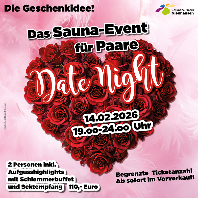 Erlebt unser romantisches Sauna-Special für Paare: Die Saunalandschaft wird zum stimmungsvollen FKK-Bereich im warmen Kerzenlicht. Freut Euch auf besondere Aufgüsse, wohltuende Sole und textilfreies Schwimmen in einzigartiger Atmosphäre. Der Abend startet mit einem prickelnden Sektempfang und wird durch ein genussvolles Buffet abgerundet. Ein romantisches Highlight für Paare, die eine gemeinsame Auszeit erleben möchten.